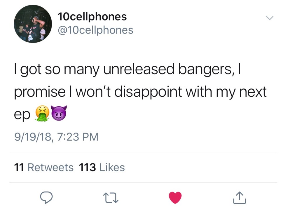 It’s most likely the reason he didn’t go with “Lil Data” or “Kidd AT&T”. 10Cellphones is a surprisingly fluent phrase and at the very least it makes whoever is seeing it wonder how that could be a musicians name.